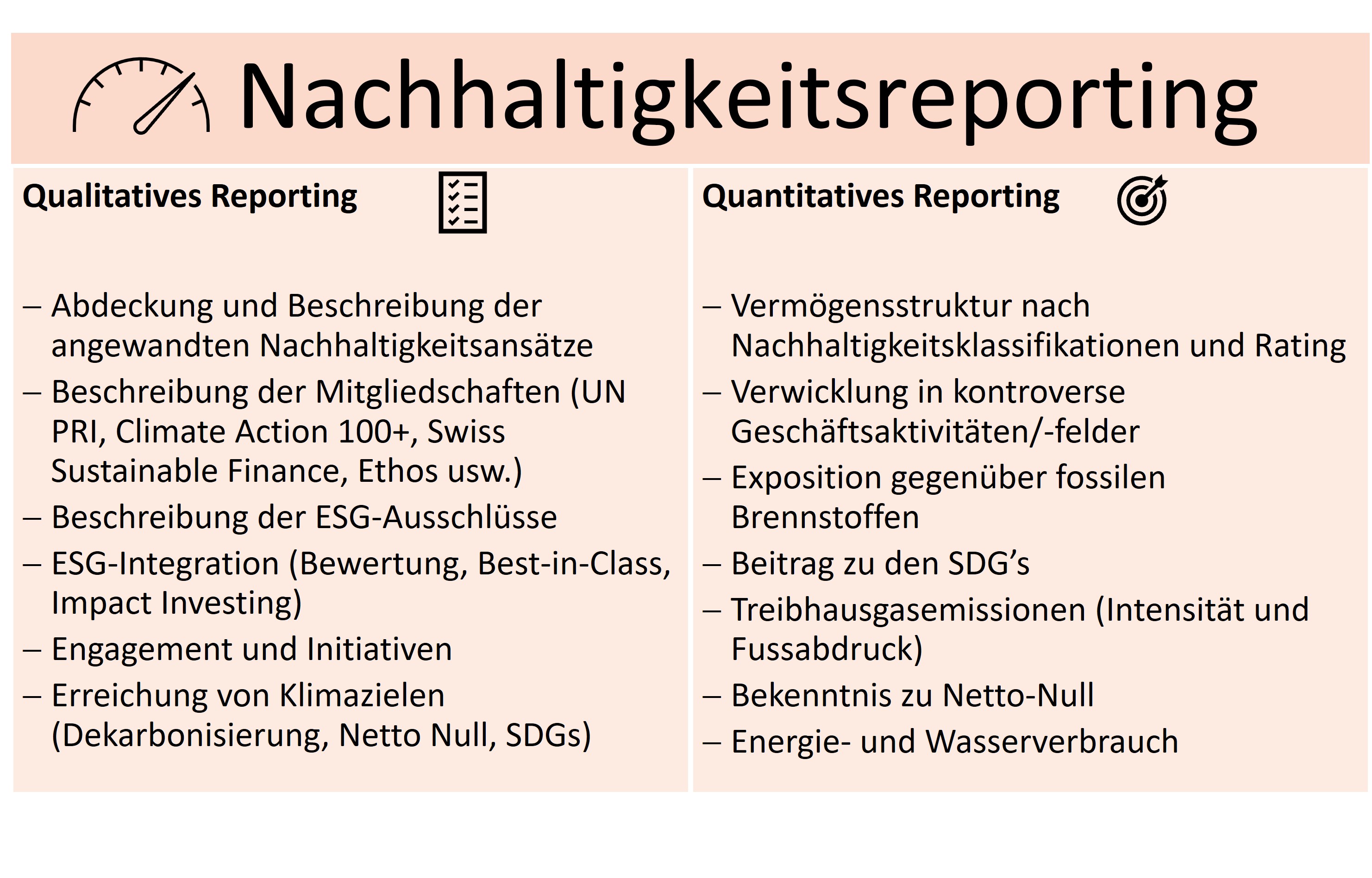 Wir haben uns seit 2019 auf den Weg begeben, nachhaltige Kriterien nicht ausschliesslich nur mit der Umsetzung des Vorsorgeauftrags, sondern auch in der Anlagebewirtschaftung systematisch zu integrieren. Das Erreichen der Anlageziele wird mittels Controlling und Investment-Reporting regelmässig überprüft und wo notwendig werden Korrekturmassnahmen ergriffen. Die regelmässige Analyse und das Reporting anhand anerkannter Nachhaltigkeits- und Ratingstandards gibt Aufschluss über die Entwicklung der verfolgten Nachhaltigkeitsabsichten (z.B. CO2 Bilanz) und die Einhaltung der Grundsätze (z.B. SVVK Ausschlüsse). Dies ist Grundlage für die kontinuierliche Weiterentwicklung.